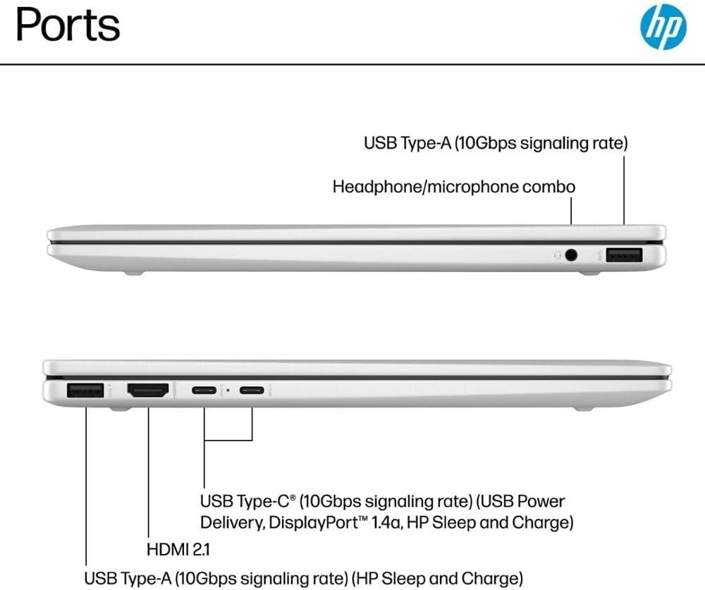 Ports: 2 USB Type-C 10Gbps signaling rate (USB Power Delivery, DisplayPort 1.4a, HP Sleep and Charge) 1 USB Type-A 10Gbps signaling rate (HP Sleep and Charge) 1 USB Type-A 10Gbps signaling rate 1 HDMI 2.1 1 headphone/microphone combo