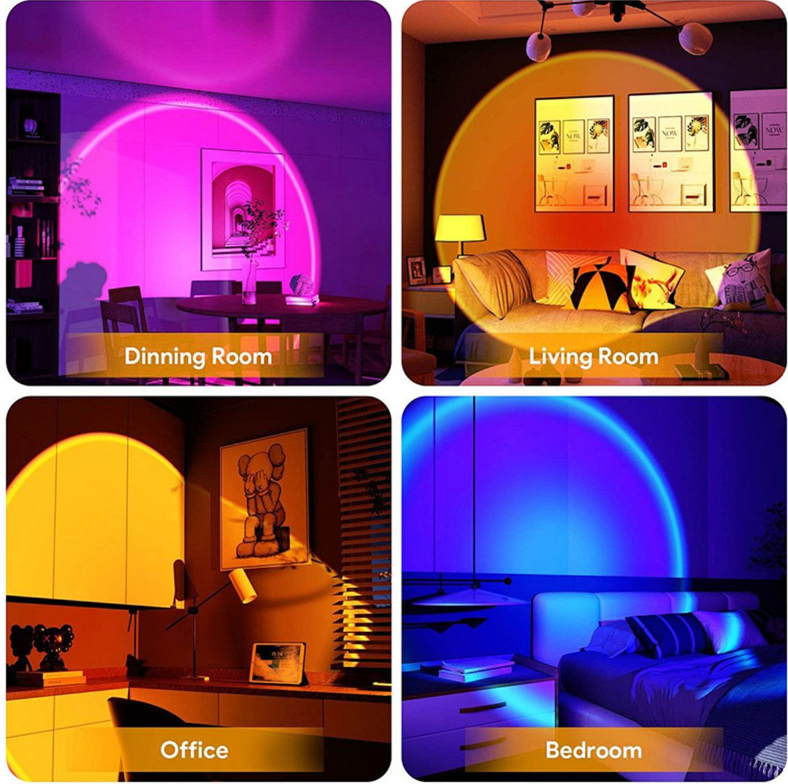 - Projects a circular halo or sunset-style light effect on walls, ceilings, or floors